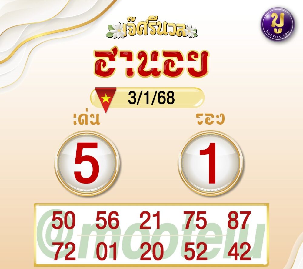 - เจ๊ศรีนวล: เด่น 5, รอง 1, เลขสองตัว 50, 75, 01