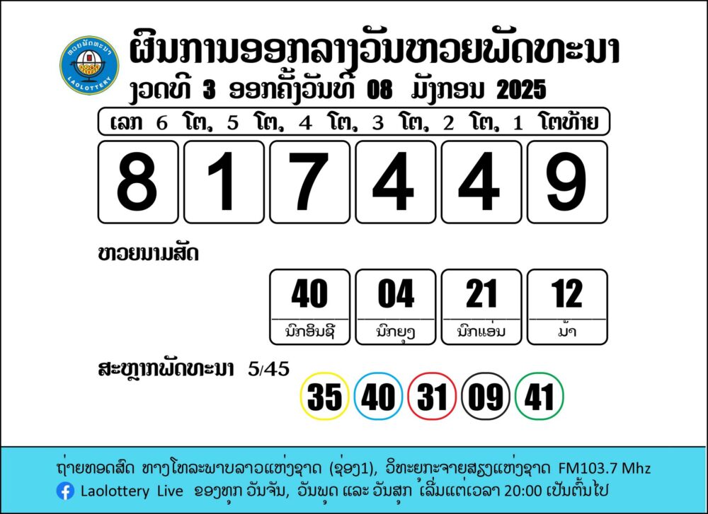 ຖ່າຍທອດສົດການອອກເລກລາງວັນຫວຍພັດທະນາ 8/1/2025
