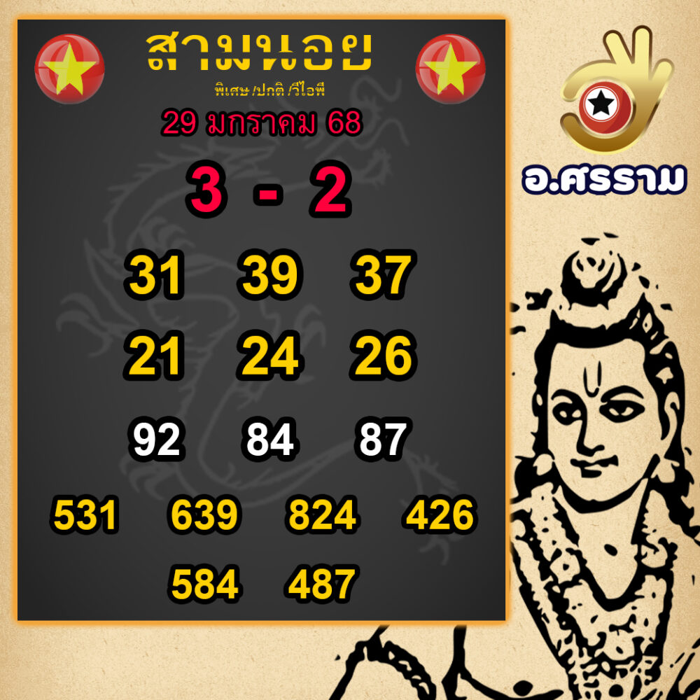 ปิดท้ายด้วย อาจารย์ศรราม สำนักที่ให้เลขแม่นยำมาโดยตลอด วันนี้เน้น เด่น 3 และ รอง 2 โดยมีเลขสองตัวที่แนะนำคือ 31, 39, 37 และเลขสามตัวที่ต้องจับตา ได้แก่ 531, 639, 824 บอกเลยว่าสำนักนี้ให้เลขแม่นยำมาก ใครชอบเลขชุดไหน เลือกเสี่ยงโชคกันได้เลยครับ!