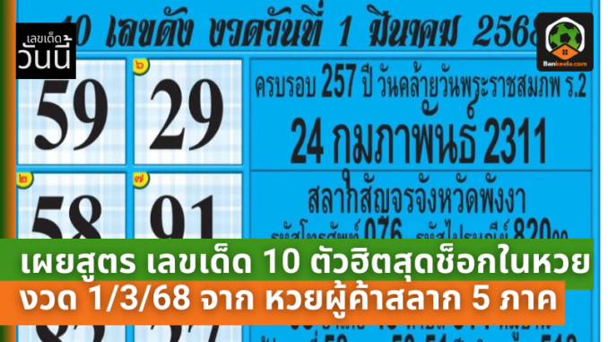 เปิด 10 อันดับเลขเด็ดขายดีงวดนี้! หวยผู้ค้าสลาก 5 ภาค งวด 1 มี.ค. 68 เลขมหามงคลมาแรง