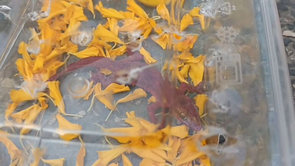 จากการสอบถาม พบว่าเช้าวันเกิดเหตุ หลานสาวของนายธนรินทร์เป็นคนแรกที่พบจิ้งจกสีแดงตัวนี้ ขณะที่เธอกำลังจุดธูปเปิดไฟศาลตามปกติ ก่อนจะรีบเรียกผู้ดูแลให้มาดูด้วยความตกใจ และพบว่าจิ้งจกตัวนี้มีลักษณะเด่นชัด คือ ทั้งตัวเป็นสีแดงสด สะดุดตาอย่างชัดเจน จึงรีบนำมาใส่ในกล่องใส พร้อมโรยดอกไม้ไว้ภายในเพื่อแสดงความเคารพ และตั้งใจจะปล่อยไว้ภายในศาล ไม่คิดนำออกไปไหน เพราะเชื่อว่าเป็นสัตว์ประจำศาลของพ่อปู่สันดร
