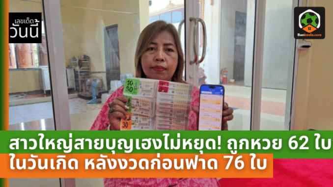 แรงไม่แผ่วสำหรับสายบุญสายโชค! เมื่อหญิงวัย 54 ปีชาวชลบุรี ดวงเฮงแบบต่อเนื่อง ถูกรางวัลสลากกินแบ่งรัฐบาลรวมถึง 62 ใบในงวดวันที่ 16 พฤษภาคมที่ผ่านมา รับเงินนับแสนบาทแบบเต็มไม้เต็มมือ โดยเฉพาะอย่างยิ่งในวันครบรอบวันเกิดของเธอเอง! งานนี้ต้องบอกว่าโชคหล่นทับจนเจ้าตัวยังแทบไม่เชื่อสายตา