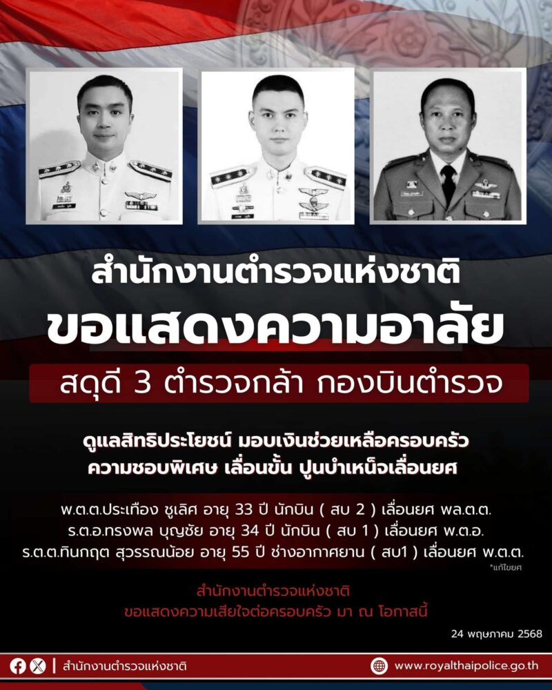 สำนักงานตำรวจแห่งชาติ (สตช.) ได้ออกแถลงการณ์แสดงความเสียใจอย่างสุดซึ้งต่อครอบครัวของผู้เสียชีวิต พร้อมยืนยันว่า จะดำเนินการดูแลด้านสิทธิประโยชน์ สวัสดิการ และเยียวยาให้แก่ครอบครัวของผู้เสียสละทั้งสามนายอย่างเต็มที่ เพื่อแสดงถึงความกตัญญูและการยอมรับในความกล้าหาญของพวกเขา