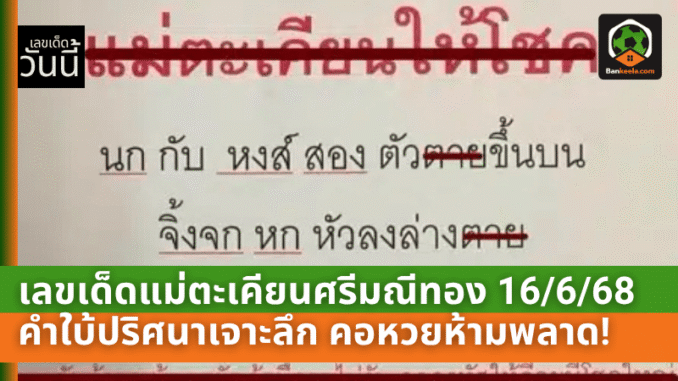 โดยในงวดนี้ “แม่ตะเคียนศรีมณีทอง” ได้ปล่อยคำใบ้ลับเฉพาะผ่านถ้อยคำชวนตีความว่า “นก กับ หงส์ สองตัวตายขึ้นบน จิ้งจก หกหัวล่างตาย” ซึ่งเหล่าคอหวยต่างรู้กันดีว่านี่คือภาษาปริศนาที่ต้องแปลออกมาเป็นตัวเลข พร้อมกันนั้นยังแนบเลขเด่นมาให้แบบไม่มีกั๊ก ได้แก่ 1 – 2 – 4 – 5 – 0 – 7 – 6