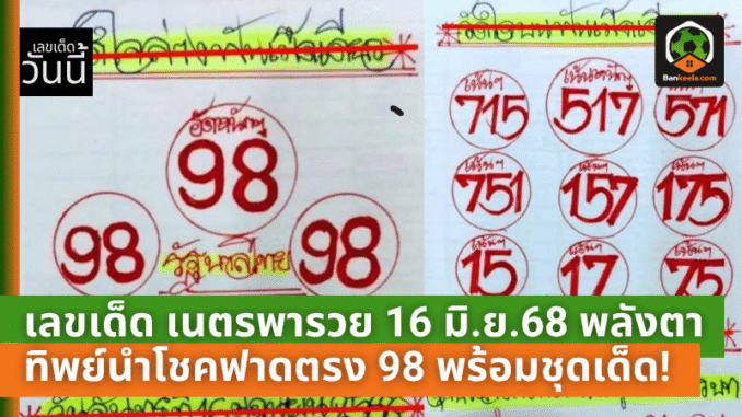 ในงวดนี้ “เนตรพารวย” ขนพลังจากตาทิพย์ที่ถูกขนานนามว่า ‘พลังทรัพย์ทะลุดวง’ พร้อมแจกโพยแบบจัดเต็มให้สายหวยทั้งรุ่นใหม่และรุ่นใหญ่ได้รีบคว้าเลขก่อนหมดแผง โดยเลขเด่นที่ถูกขีดเส้นใต้ไว้แดง ๆ เน้นให้ซื้อก่อนใครคือเลข 98 ซึ่งถือเป็นตัวเลขพลังสูงในทางโชคลาภและการเงินที่ไม่ควรมองข้ามเด็ดขาด