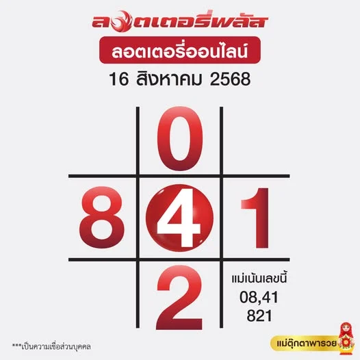 ชุด เลข 3 ตัว ที่ปล่อยออกมาคือ 042 – 841 – 821 ทั้งหมดนี้ถือว่าน่าสนใจ เพราะบางชุดเคยโผล่ในรางวัลเลขท้าย 3 ตัวมาแล้ว ส่วน เลข 2 ตัว ได้แก่ 08 – 41 โดยเฉพาะเลข 41 ที่ถูกจับตามองเป็นพิเศษ เนื่องจากเคยออกเป็นรางวัลเลขท้าย 2 ตัวเมื่อปลายปีที่แล้ว ทำให้มีโอกาสสูงที่จะวนกลับมาอีกครั้ง