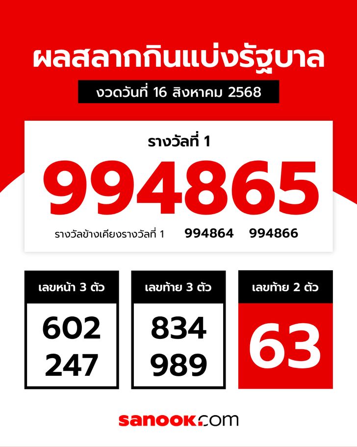 หลังจากสำนักงานสลากกินแบ่งรัฐบาลทำการออกรางวัลประจำงวดวันที่ 16 สิงหาคม 2568 ปรากฏว่า