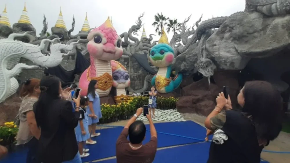 บรรยากาศภายในอุทยานธรรมพญานาคราชพระปางเปิดโลกคึกคักเกินบรรยาย โดยเฉพาะจุดที่ตั้ง “พญานาคน้อย” ซึ่งกลายเป็นแลนด์มาร์กใหม่ของสายมู ล่าสุดทางวัดดอนใหญ่ได้จัดสร้างพญานาคน้อยเพิ่มอีก 2 ตน สีสันสดใสสะดุดตา ทั้งพญานาคสีชมพูและสีม่วง ถูกตกแต่งอย่างวิจิตรบรรจงจนกลายเป็นจุดเช็กอินที่นักท่องเที่ยวต่างต่อคิวถ่ายรูปไม่ขาดสาย