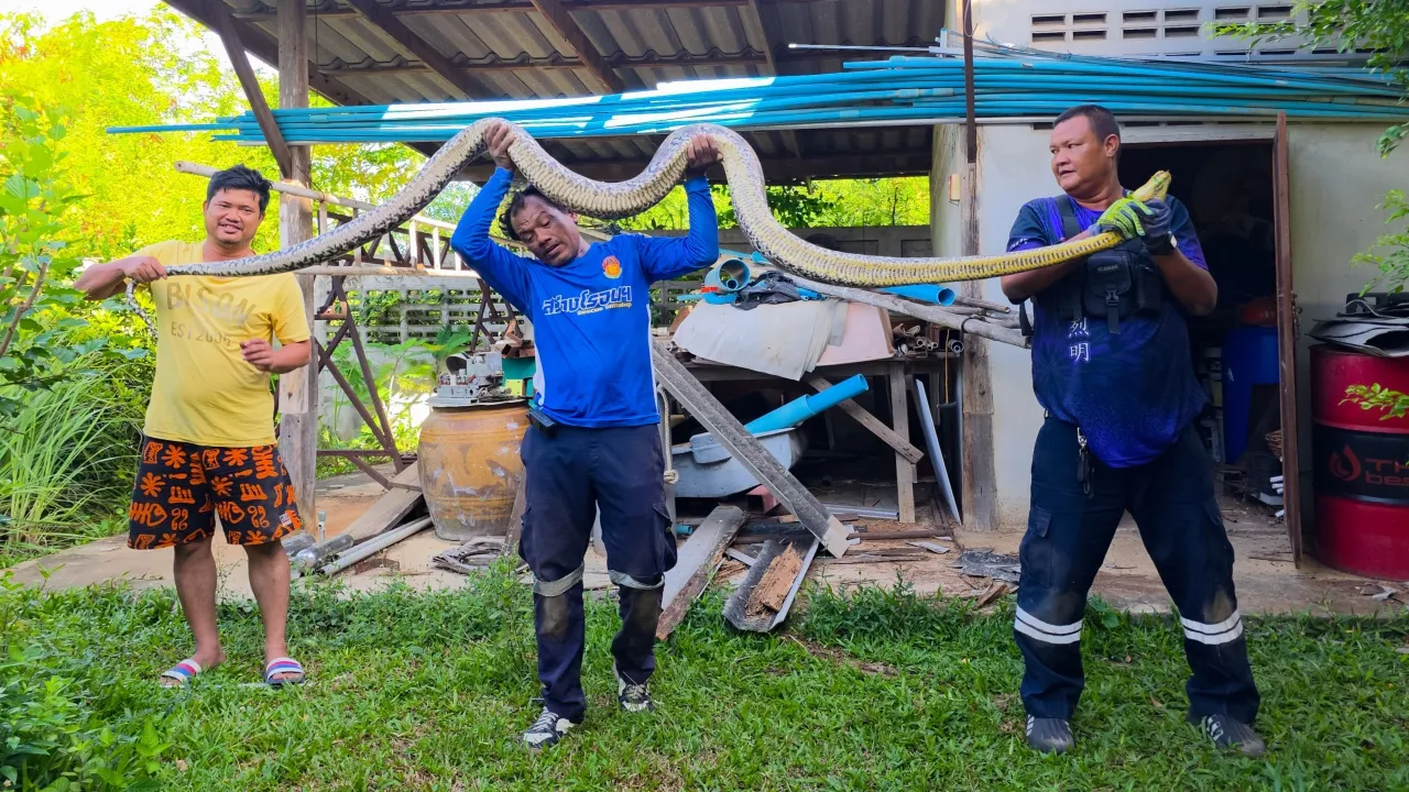 เจ้าหน้าที่กู้ภัยจำนวน 3 นายพร้อมอุปกรณ์จับงูรีบรุดเข้าที่เกิดเหตุทันที เมื่อตรวจสอบพบงูเหลือมขนาดมหึมา ยาวกว่า 5 เมตร ซ่อนตัวอยู่ในห้องเก็บของหลังบ้าน โดยเลื้อยพันแน่นอยู่ใต้ชั้นวางของ การจับเป็นไปอย่างยากลำบาก เจ้าหน้าที่ต้องใช้เวลาเกือบ 30 นาทีเต็ม กว่าจะสามารถควบคุมตัวมันได้สำเร็จ ท่ามกลางเสียงลุ้นระทึกจากชาวบ้านที่มายืนดู