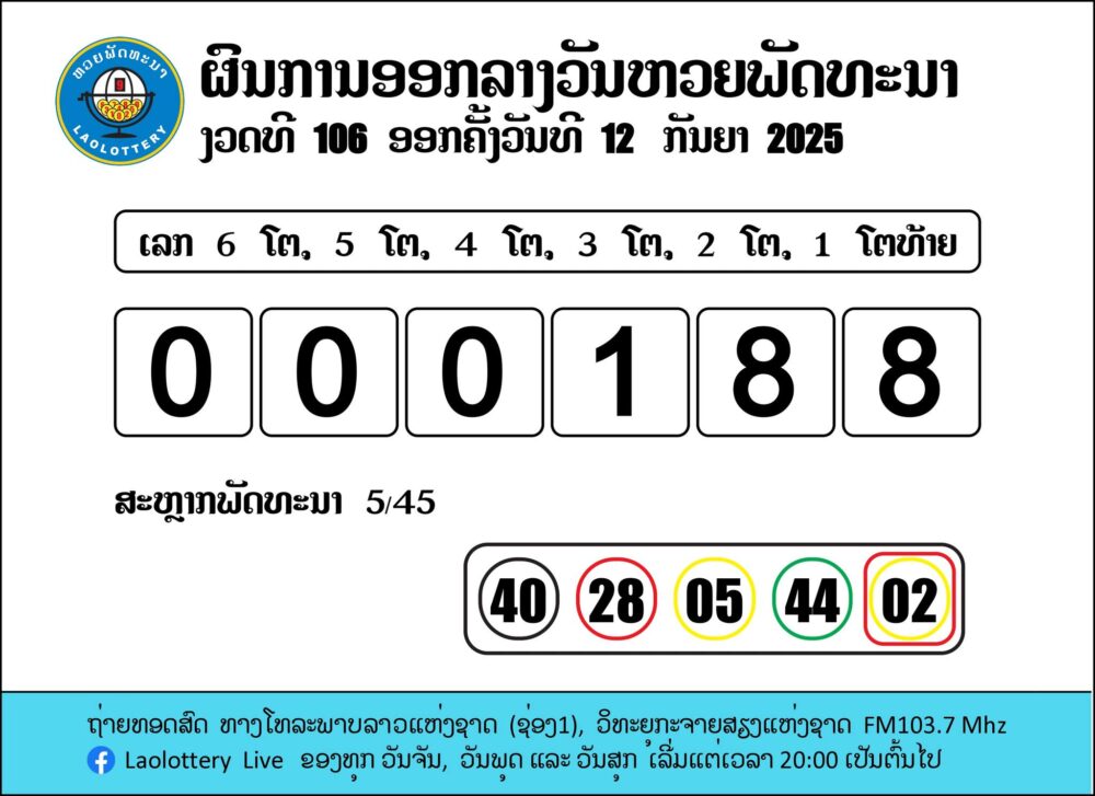 ຖ່າຍທອດສົດການອອກເລກລາງວັນຫວຍພັດທະນາ 12/09/2568