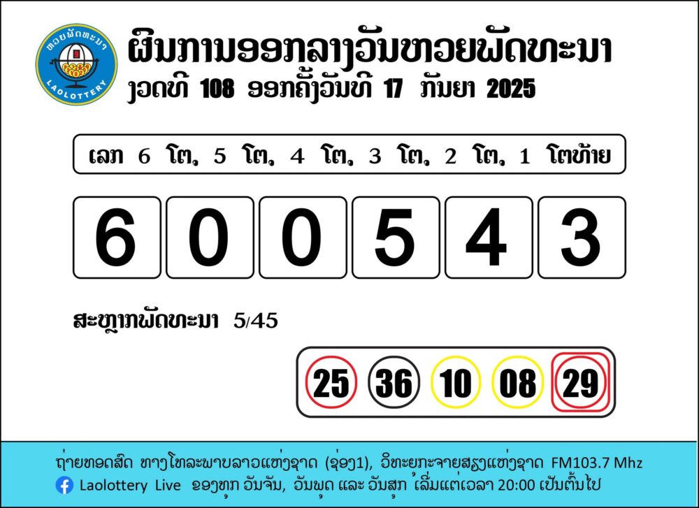 ຖ່າຍທອດສົດການອອກເລກລາງວັນຫວຍພັດທະນາ 17/09/2568