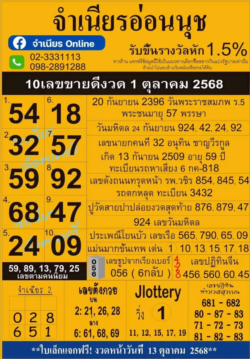 10 เลขขายดีจำเนียรอ่อนนุช งวด 1 ตุลาคม 68 มาแล้ว! ของดีคอหวยห้ามพลาด ส่องก่อนรวยก่อน!