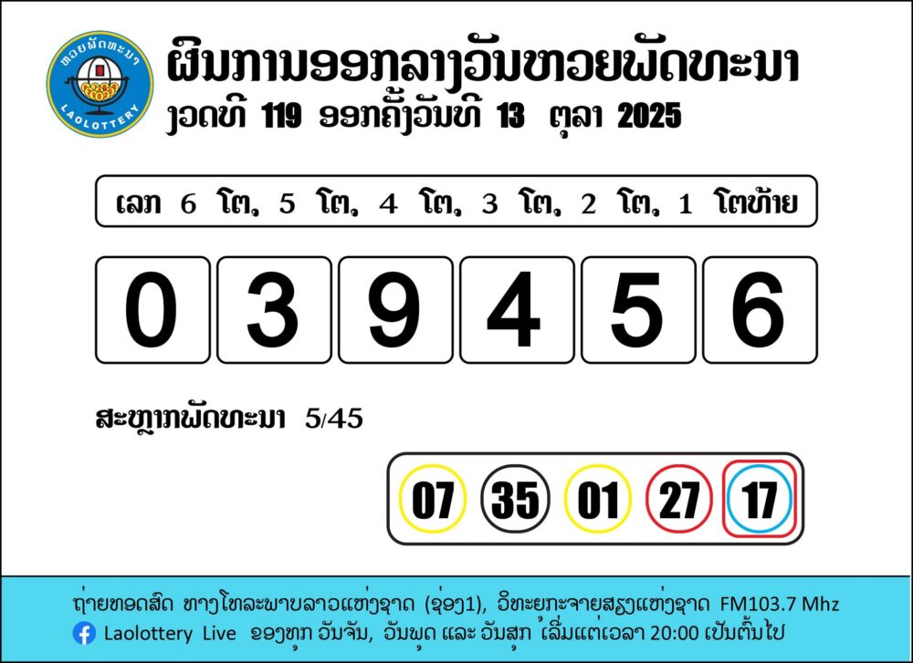 ตรวจหวยลาว (ຫວຍລາວ) งวดประจำวันที่ 13/10/2568