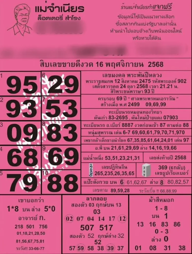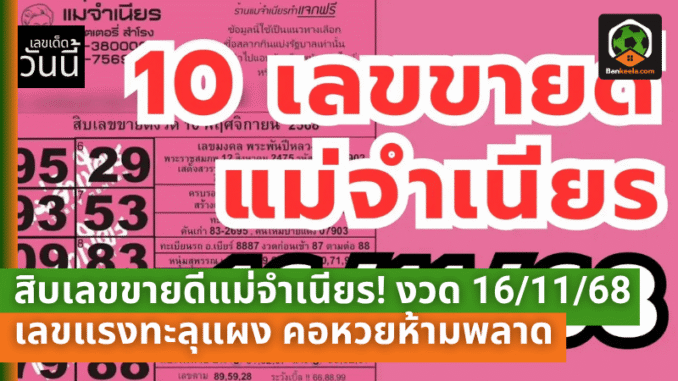 สิบเลขขายดีแม่จำเนียร งวด 16 พฤศจิกายน 2568