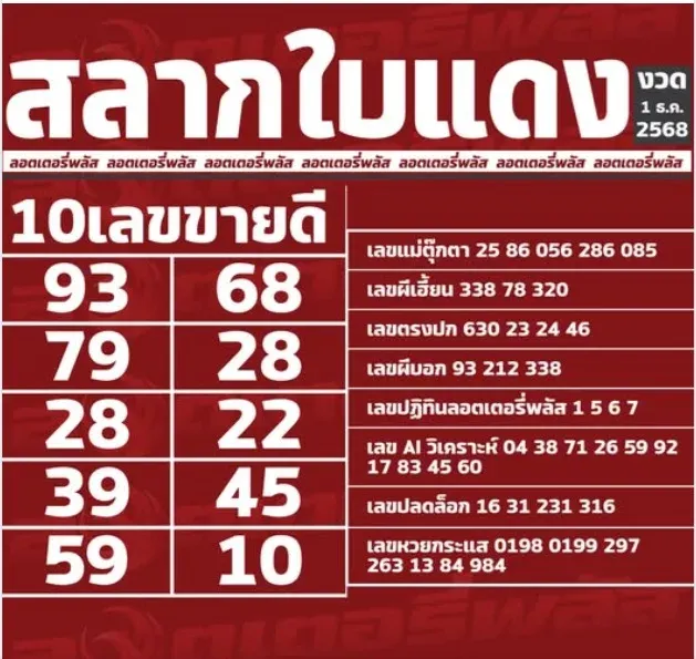10 เลขขายดีจาก สลากใบแดง งวดวันที่ 1 ธันวาคม 2568 ถูกจับตาอย่างหนักในโค้งสุดท้ายก่อนวันหวยออก คอหวยหลายคนกำลังเร่งเช็กเลขในมือ บางคนยังวิ่งหาลอตเตอรี่เพิ่ม เพราะเชื่อว่ากระแสเลขขายดีนี่แหละ คือหนึ่งในสัญญาณสำคัญของดวงลุ้นรวย ใครที่ยังไม่มีเลขในใจ หรือยังลังเลไม่รู้จะไปทางไหนดี การลองส่องชุดเลขขายดีจากสลากใบแดงก็ถือเป็นอีกหนึ่งมุมมองที่ช่วยประกอบการตัดสินใจได้ไม่เลว
