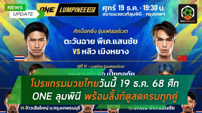 ค่ำคืนวันศุกร์ที่ 19 ธันวาคม 2568 แฟนมวยไทยได้ลุ้นกันยาวๆ กับ โปรแกรมมวยไทยวันนี้ ที่แน่นเอี๊ยด ทั้งศึกใหญ่บนสังเวียนลุมพินีและรายการดังที่คอมวยคุ้นชื่อกันดี ไม่ว่าจะเป็นมวยไทย 7 สี, ศึก ONE ลุมพินี, ศึกจ้าวมวยไทย ช่อง 3, ศึก RWS ราชดำเนิน เวิลด์ซีรีส์, ไทยไฟท์ และศึกเพชรยินดี ที่ช่วยกันขับเคลื่อนกระแสวงการมวยให้ร้อนระอุแทบทุกสัปดาห์