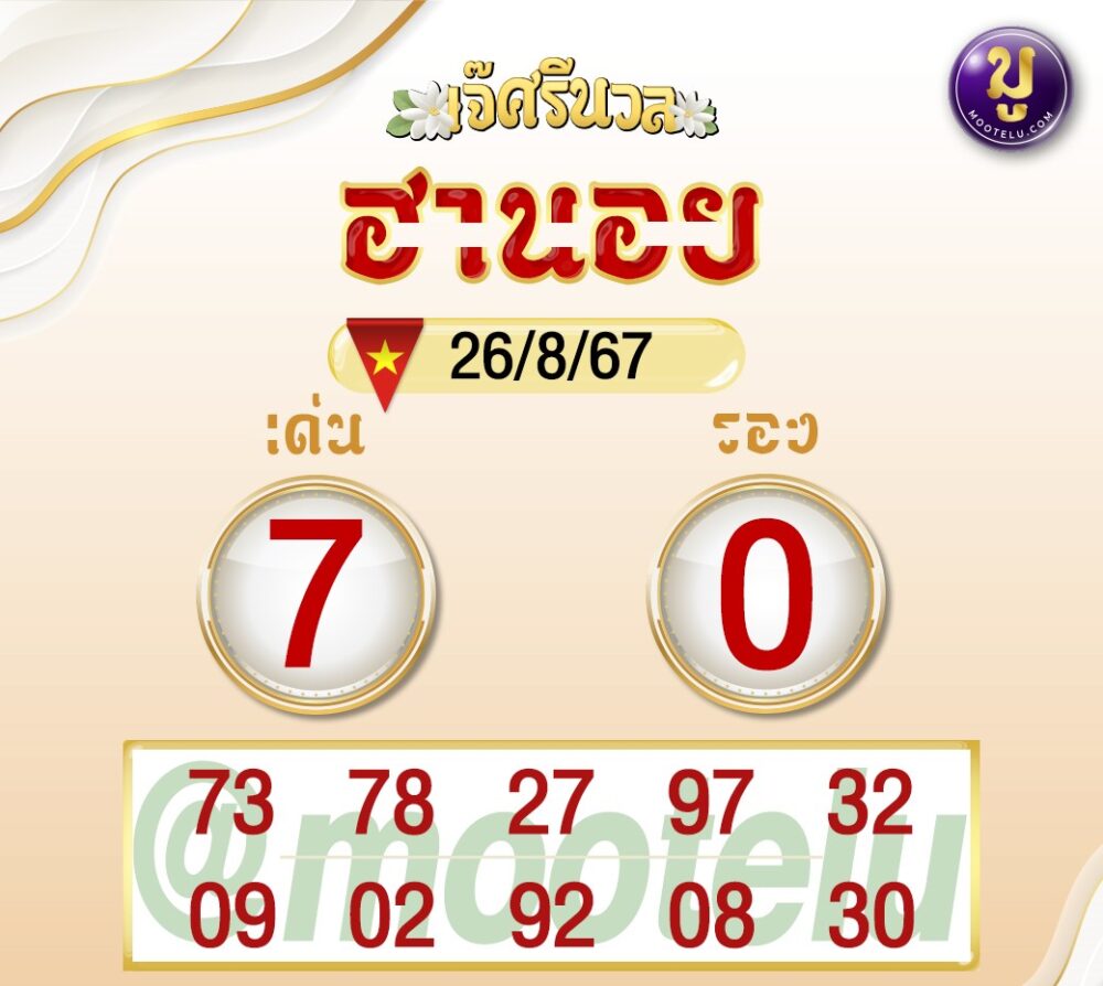 เจ๊ศรีนวลเน้นให้ความสำคัญกับเลขเด่น 7 ที่มาแรงในวันนี้ พร้อมด้วยเลขรอง 0 โดยชุดเลขสองตัวที่แนะนำ เช่น 73, 78, 09, 92 และ 97 เป็นเลขที่น่าสนใจและควรพิจารณาในการเสี่ยงโชค