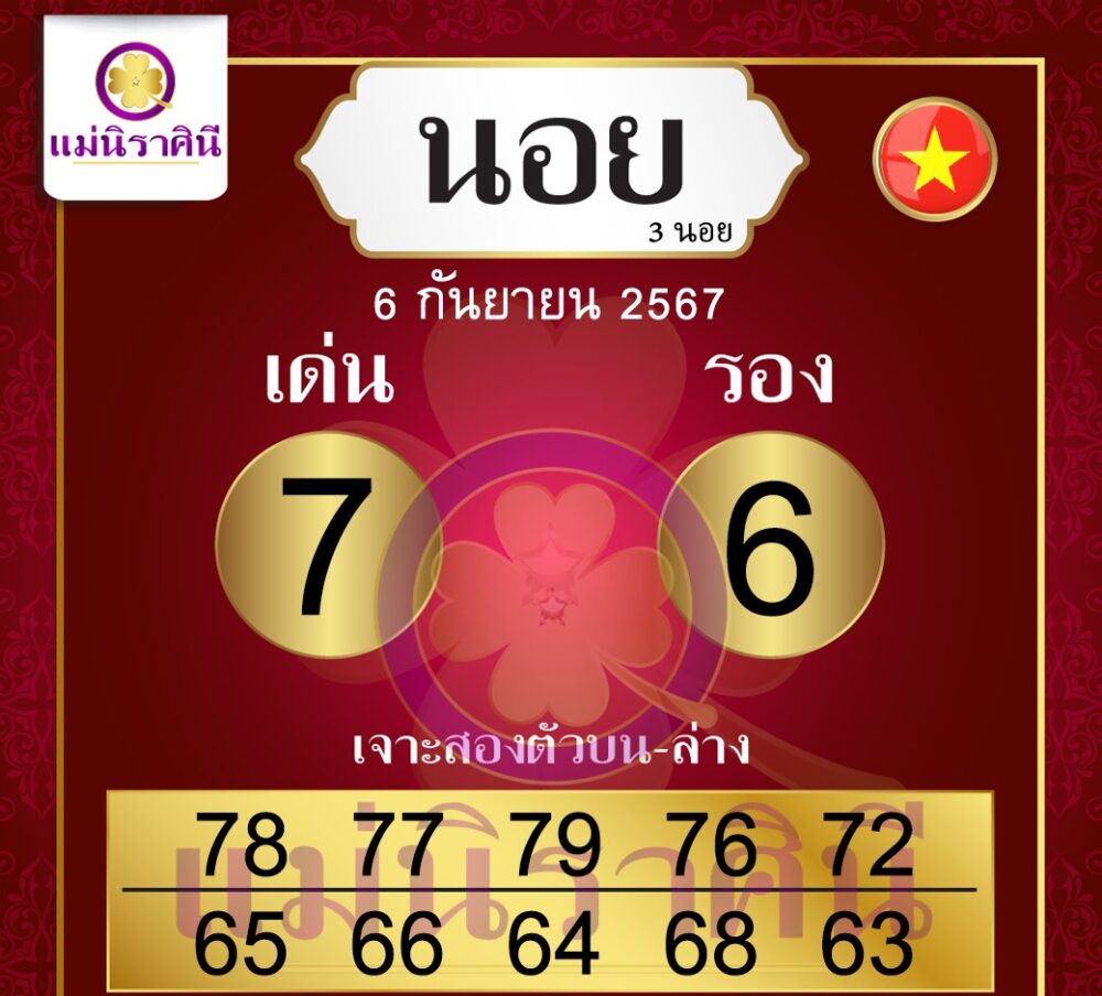 แม่นิราศินีให้เลขเด่น 7 ซึ่งเป็นตัวเลขที่มีโอกาสออกสูงในงวดนี้ โดยมีเลขรอง 6 ที่สามารถจับคู่เป็นเลขที่น่าสนใจได้ เช่น 78, 77, และ 63 ที่น่าลงทุนสำหรับการเสี่ยงโชค