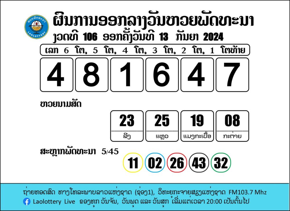 ຖ່າຍທອດສົດການອອກເລກລາງວັນຫວຍພັດທະນາ 13/09/2024