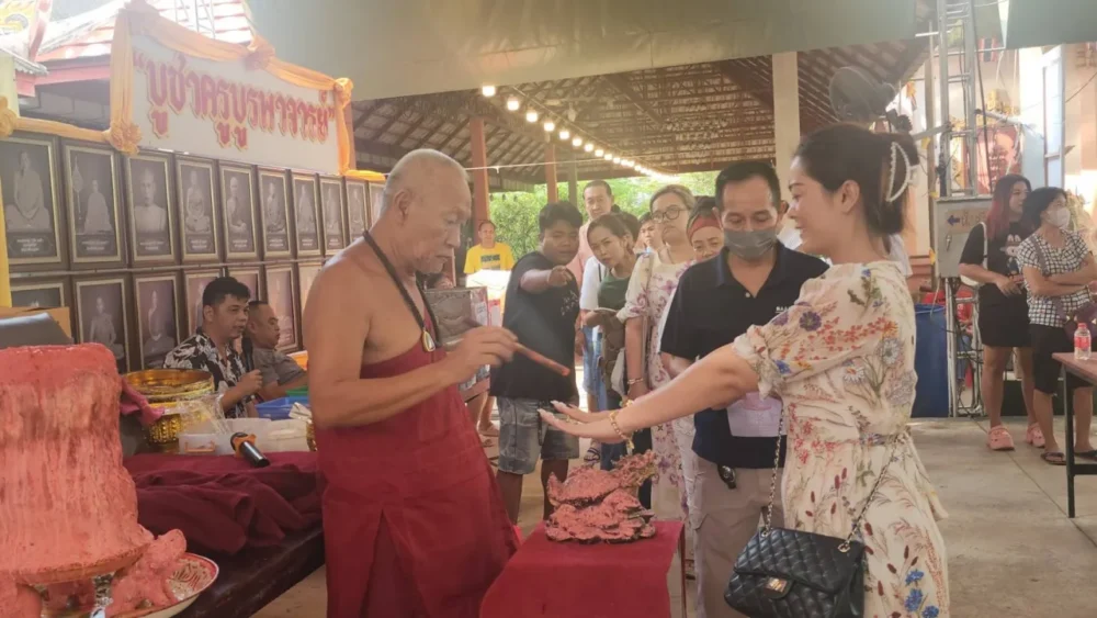 หนึ่งในสาธุชนผู้เดินทางมาไกลก็คือ นางสาวจินตนา สุขสมหมาย อายุ 47 ปี ชาวจังหวัดแพร่ ผู้มีอาชีพค้าเฟอร์นิเจอร์ไม้ เธอเปิดเผยว่าการเดินทางครั้งนี้เป็นการเดินทางยาวนานกว่า 7 ชั่วโมง เพื่อมาเข้าพิธีลงยันต์หลังมือกับ หลวงพ่อแป๊ะ และยังตั้งใจมาขอพรและโชคลาภจาก ตาทองงิ้วราย โดยเฉพาะ นางสาวจินตนาเล่าว่าชื่อเสียงของตาทองงิ้วรายนั้นดังกระฉ่อนไปทั่วภาคเหนือและภาคอีสาน ทำให้เธอตั้งใจเดินทางมาไกลเพื่อได้พบหุ่นปั้นอันศักดิ์สิทธิ์นี้ด้วยตนเอง