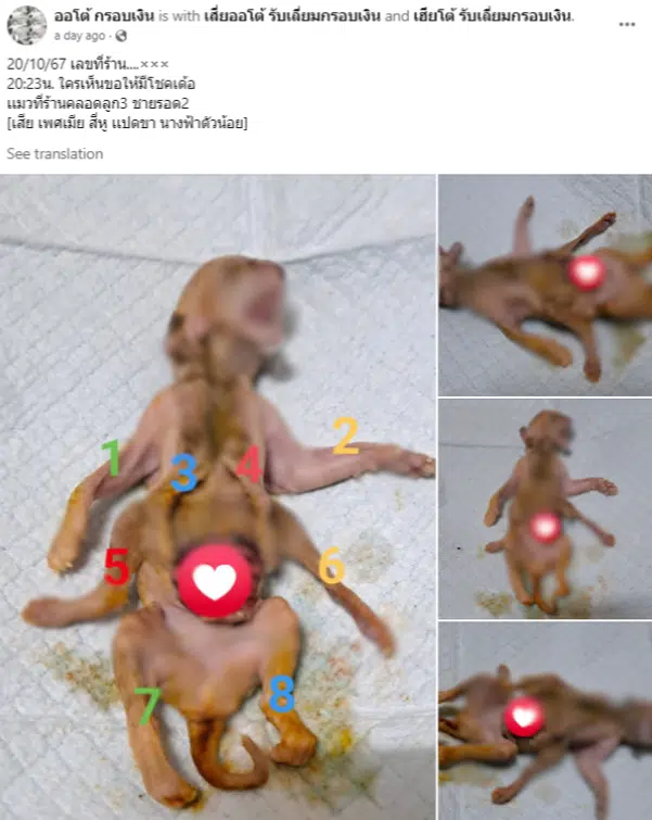 เหตุการณ์นี้เกิดขึ้นที่ร้านพระเครื่องชื่อดังแห่งหนึ่งในอำเภอบ้านบึง จังหวัดชลบุรี โดยผู้ใช้เฟซบุ๊กชื่อ ออโต้ กรอบเงิน ซึ่งเป็นเจ้าของร้าน ได้โพสต์ภาพของลูกแมวที่เพิ่งคลอดออกมา จำนวน 3 ตัว แต่หนึ่งในนั้นที่เป็นเพศเมีย มีลักษณะพิเศษสุดแปลก คือมี 8 ขาและ 4 หู ซึ่งถือเป็นเรื่องที่ไม่ค่อยเกิดขึ้น เจ้าของร้านกล่าวว่า แมวตัวนี้คลอดออกมาเมื่อวันที่ 20 ตุลาคม 2567 เวลา 20.23 น. แม้จะมีรูปลักษณ์ที่ผิดปกติ แต่น่าเสียดายที่มันเสียชีวิตทันทีหลังคลอด ทำให้ผู้คนพากันสนใจและตีความหมายของเหตุการณ์นี้เป็นลางดีหรือโชคลาภ