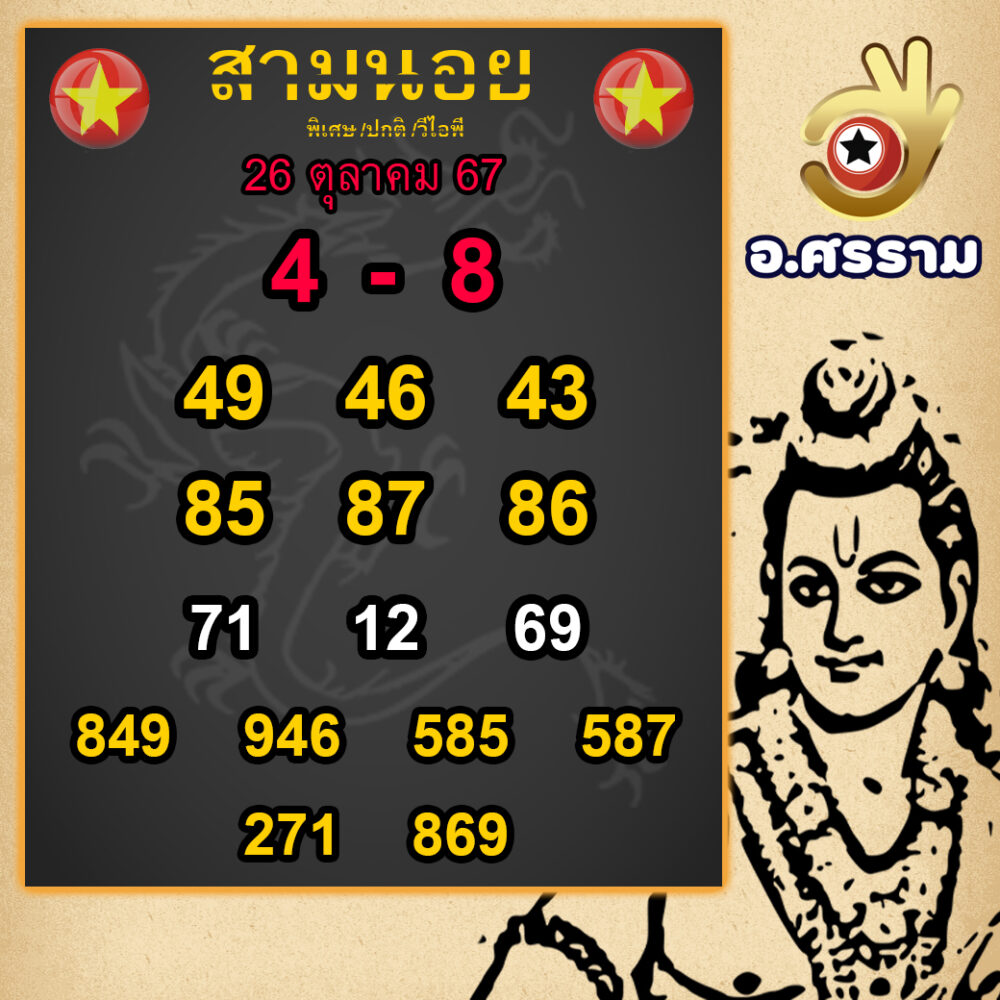 อาจารย์ศรรามให้เลขเด่นคือ 4 และรองเป็นเลข 8 สำหรับเลขสามตัวที่น่าสนใจได้แก่ 849 และ 946 ซึ่งเป็นตัวเลขที่คนรักหวยไม่ควรพลาด!