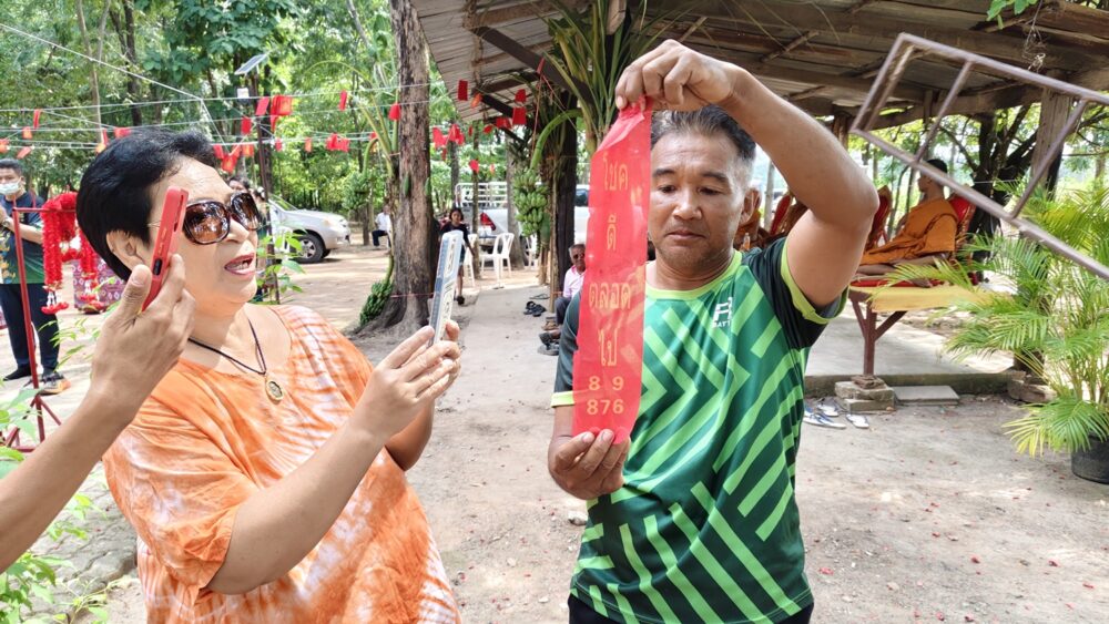 เมื่อจุดประทัดแล้ว เสียงดังก้องท้องฟ้า แต่หางประทัดดันไม่หล่นลงมาตามที่คาดการณ์ กลับห้อยติดอยู่บนกิ่งไม้ ชาวบ้านพากันชะเง้อมองพร้อมกับความตื่นเต้น แต่ก็ยังมองไม่เห็นเลขชัดเจน ทำให้ทีมงานต้องหาบันไดปีนขึ้นไปดึงลงมา แต่เรื่องราวยังไม่จบเพียงเท่านั้น ขณะที่นำหางประทัดลงมา แผ่นเลขกลับติดอยู่บนกิ่งไม้อีกครั้ง! ต้องปีนขึ้นไปเก็บอีกรอบจนสุดท้ายแผ่นเลขหางประทัดถึงจะลงมาให้ทุกคนได้เห็นชัด ๆ สักที