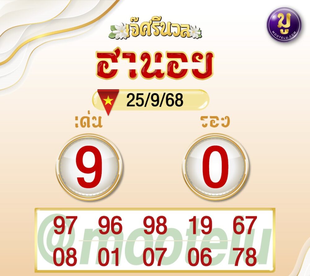 เจ๊ศรีนวล ชี้ชัดไปที่เลข 9 เสริมด้วย 0 เลขที่น่าลุ้นคือ 97 – 96 – 98 ซึ่งจัดว่าเป็นเลขแรงและมีแนวโน้มสูง
