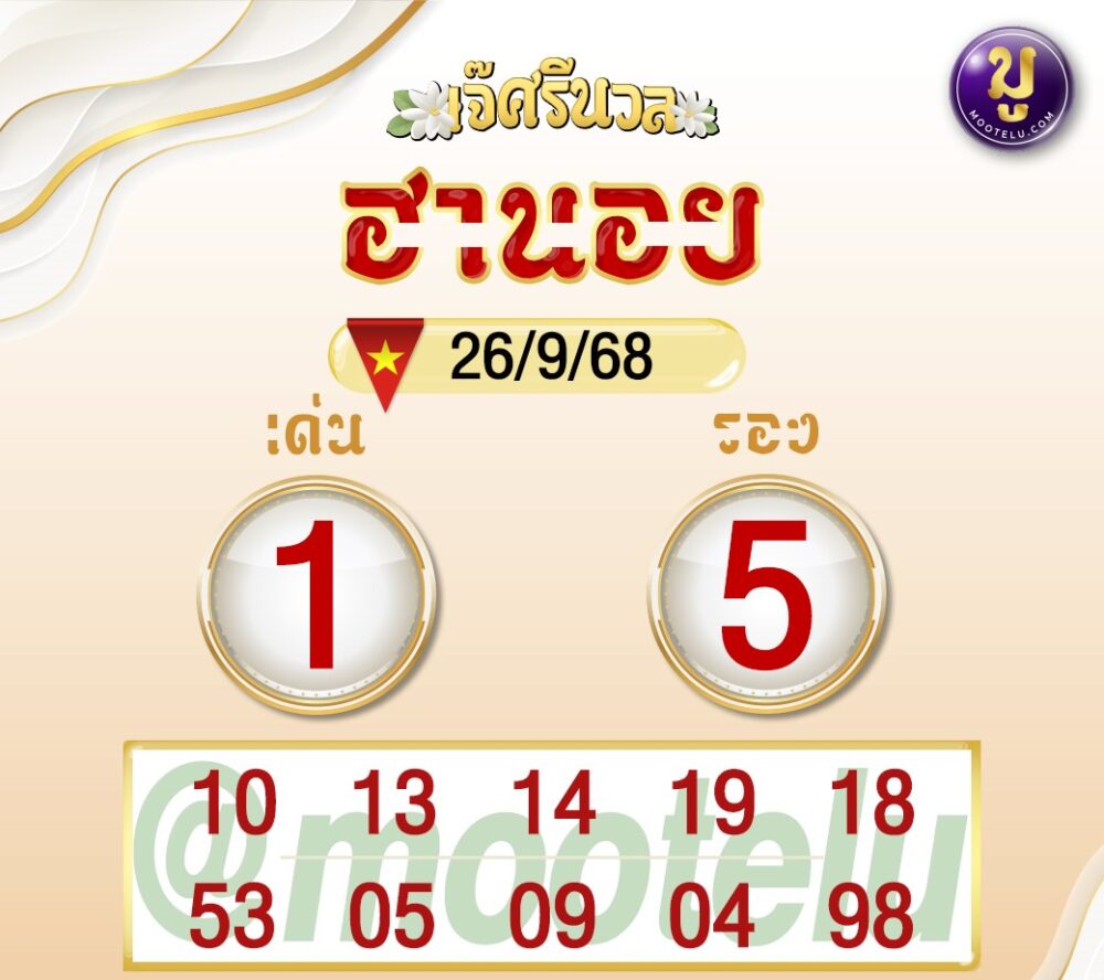 เจ๊ศรีนวล เน้นไปที่เลข 1 เป็นหลัก เสริมด้วยเลข 5 โดยชุดที่น่าตามคือ 10 – 13 – 14 ซึ่งเคยออกบ่อยในงวดก่อน ๆ