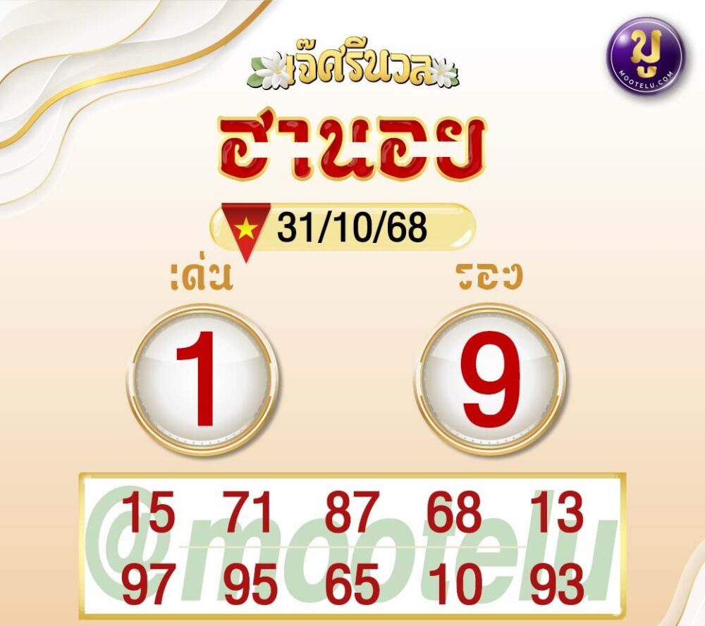 เจ๊ศรีนวลขอเปิดโพยเด็ดรับปลายเดือน เด่น “1” รอง “9” ซึ่งถือว่าแรงตรงใจสายเน้นล่าง และมีเลขชนกับแม่นิราศินีอย่าง “71” และ “79” แบบเป๊ะๆ