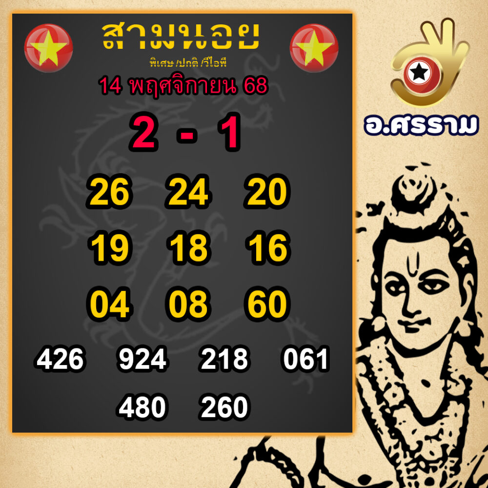 งวดนี้อ. ศรรามเปิดด้วยเลข 2–1 ที่ดันไปชนกับแนวทางแม่นิราศินีเต็ม ๆ โดยเฉพาะเลข 26, 24, 20 ที่เป็นชุดเด่นของสายบน–ล่างช่วงนี้ ชุดสามตัวยังมีหลายตัวเข้าเงื่อนไขสถิติปลายเดือนด้วย เช่น 426 และ 218