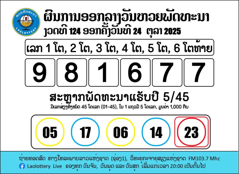ຖ່າຍທອດສົດການອອກເລກລາງວັນຫວຍພັດທະນາ 24/10/2025