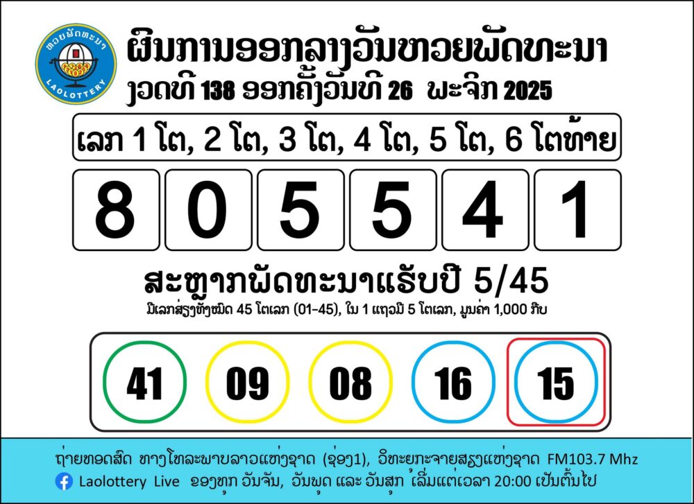 ຖ່າຍທອດສົດການອອກເລກລາງວັນຫວຍພັດທະນາ 26/11/2025