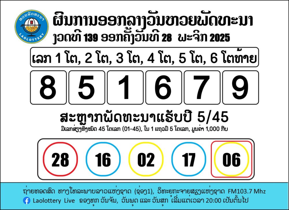 ຖ່າຍທອດສົດການອອກເລກລາງວັນຫວຍພັດທະນາ 28/11/2025