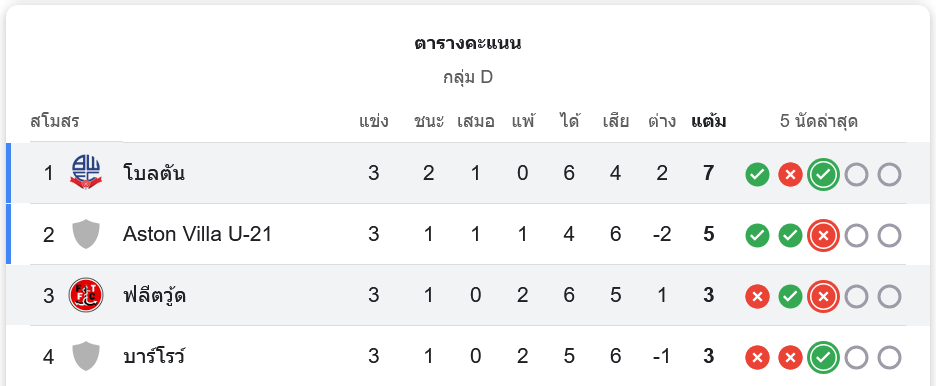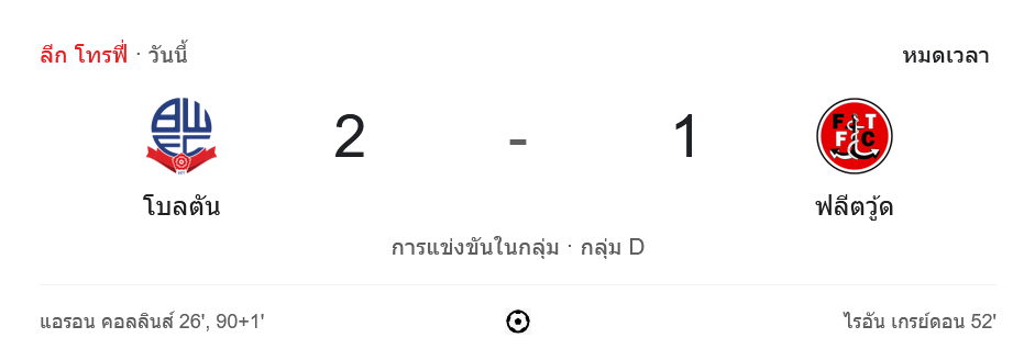 โบลตันขึ้นนำเป็นจ่าฝูงกลุ่ม D ด้วยการเก็บ 7 คะแนนจาก 3 นัด ขณะที่ฟลีตวู้ดยังคงอยู่อันดับที่ 3 มีเพียง 3 คะแนน ต้องเร่งฟอร์มในนัดถัดไปเพื่อหวังโอกาสเข้ารอบต่อไป