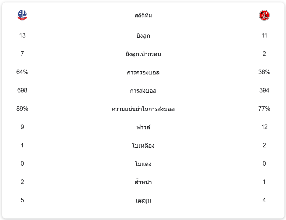 โบลตันครองบอลได้มากถึง 64% และมีการจ่ายบอลทั้งหมด 698 ครั้ง โดยมีความแม่นยำถึง 89% ขณะที่ฟลีตวู้ดครองบอลเพียง 36% และจ่ายบอลทั้งหมด 394 ครั้ง ความแม่นยำอยู่ที่ 77% โบลตันมีโอกาสยิง 13 ครั้ง เข้ากรอบ 7 ครั้ง ส่วนฟลีตวู้ดยิงทั้งหมด 11 ครั้ง เข้ากรอบเพียง 2 ครั้ง