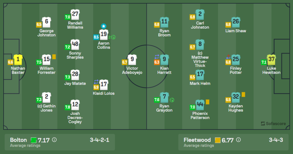 แอรอน คอลลินส์ ทำผลงานโดดเด่นในเกมนี้ด้วยการยิงสองประตูสำคัญ ได้รับคะแนนสูงถึง 8.5 และเป็นกำลังสำคัญที่ทำให้โบลตันคว้าชัยในนัดนี้