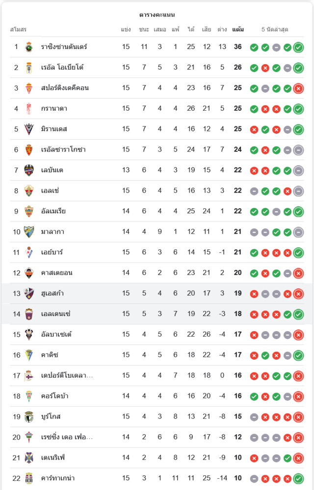 เอลเดนเซ่เก็บสามแต้มเพิ่มขึ้น มีคะแนนรวม 18 แต้ม ขยับขึ้นมาอยู่ในอันดับที่ 14 ขณะที่ฮูเอสก้ายังคงมี 19 แต้ม อยู่ในอันดับที่ 13 อย่างหวุดหวิด