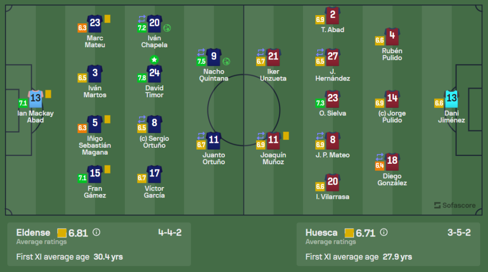 เอลเดนเซ่เลือกใช้แผน 4-4-2 ที่เน้นการปิดเกมแดนกลางและสวนกลับอย่างรวดเร็ว ขณะที่ฮูเอสก้าใช้แผน 3-5-2 ซึ่งเพิ่มความหนาแน่นในแดนกลาง แต่ไม่สามารถป้องกันจังหวะสวนกลับของเอลเดนเซ่ได้ โดยเฉพาะ เดวิด ทิมอร์ ที่เป็นตัวเชื่อมเกมสำคัญและมีบทบาทโดดเด่นตลอดเกม