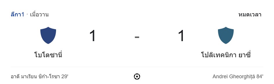 ผลบอลสดจากศึก โรมาเนีย ลีกา 1 คืนนี้ โบโตซานี่ และ โปลิเทคนิก้า อายซี่ ต่างแบ่งแต้มกันไปด้วยสกอร์ 1-1 ในแมตช์ที่เต็มไปด้วยความเข้มข้น และการดวลแทคติกที่น่าตื่นเต้น ประตูแรกเป็นของ อาดรี ชิก้า-โรซ่า ในนาทีที่ 29 ก่อนที่ อันเดร เกออร์กิต้า ของทีมเยือนจะตีเสมอในนาทีที่ 84 แม้ทั้งสองทีมจะมีโอกาสสร้างความต่าง แต่สุดท้ายผลเสมอก็ยุติทุกอย่างไว้ที่จุดนี้