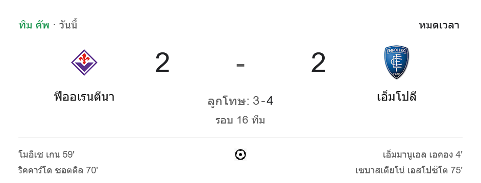 บ้านผลบอล สรุปผล ฟิออเรนติน่า เปิดศึกดุเดือดเสมอ เอ็มโปลี ก่อนพ่ายดวลจุดโทษ 3-4 ในศึกโกปปาอีตาเลีย 2024