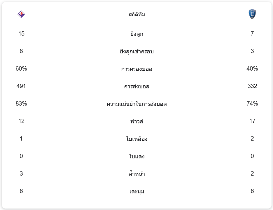 ฟิออเรนติน่าครองบอลได้ 60% พร้อมการส่งบอลที่แม่นยำถึง 83% และยิงทั้งหมด 15 ครั้ง แต่ไม่สามารถปิดเกมได้ ขณะที่เอ็มโปลีครองบอลเพียง 40% แต่ใช้โอกาสที่มีอย่างคุ้มค่า โดยยิงเข้ากรอบถึง 3 ครั้งจาก 7 ครั้ง