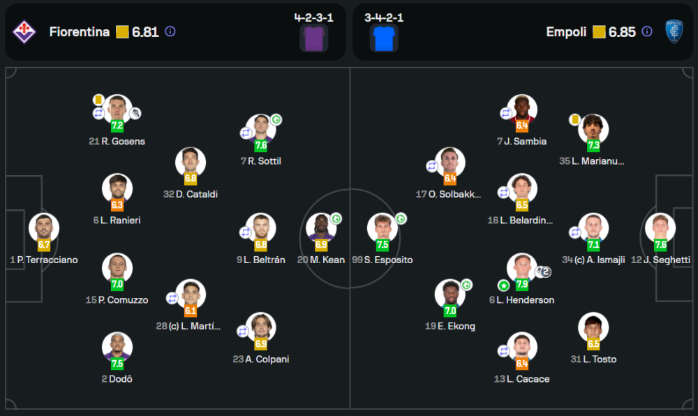 • 🟨 ใบเหลือง: ฟิออเรนติน่า 1 ใบ, เอ็มโปลี 2 ใบ