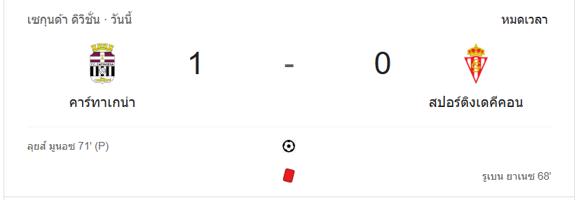 นาทีที่ 90+4: ผู้ตัดสินเป่านกหวีดหมดเวลา คาร์ทาเกน่าเอาชนะสปอร์ติ้ง กิฆอนไปได้ 1-0