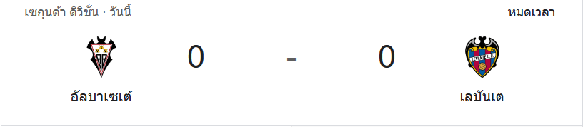 การแข่งขันในวันนี้ระหว่าง อัลบาเซเต้ และ เลบานเต้ จบลงด้วยผลเสมอ 0-0 ในเกมที่เต็มไปด้วยการปะทะและโอกาสยิงมากมาย แต่ไม่มีทีมไหนสามารถเจาะตาข่ายคู่แข่งได้ ขณะที่ ผลบอลสด เกมนี้ถูกจับตามองจากแฟนบอลที่ลุ้นชัยชนะของทั้งสองทีม