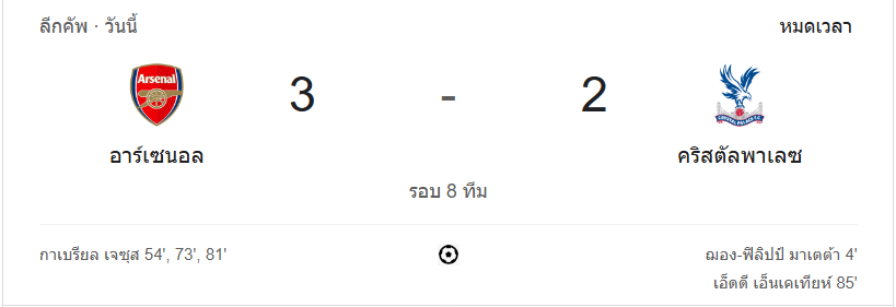 จบเกม: อาร์เซนอลชนะ คริสตัล พาเลซ 3-2 ในเกมที่เต็มไปด้วยความมันส์และดราม่า โดยเฉพาะแฮตทริกของ กาเบรียล เชซุส ที่ช่วยให้อาร์เซนอลคว้าชัยไปได้ในที่สุด