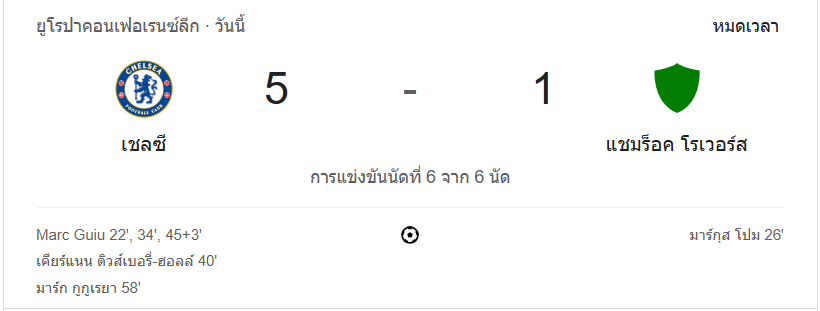นาทีที่ 90+3: จบเกม เชลซีชนะด้วยสกอร์ 5-1 คว้าชัยชนะอย่างงดงามในรอบแบ่งกลุ่ม ยูฟ่ายูโรปาคอนเฟอเรนซ์ลีก