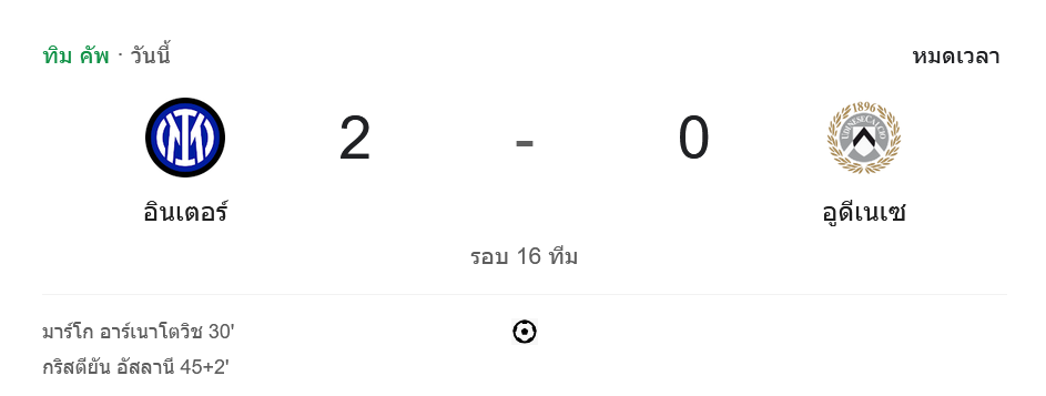 - นาทีที่ 45+2: คริสเตียน อัสลานี่ ยิงให้อินเตอร์หนีห่าง 2-0