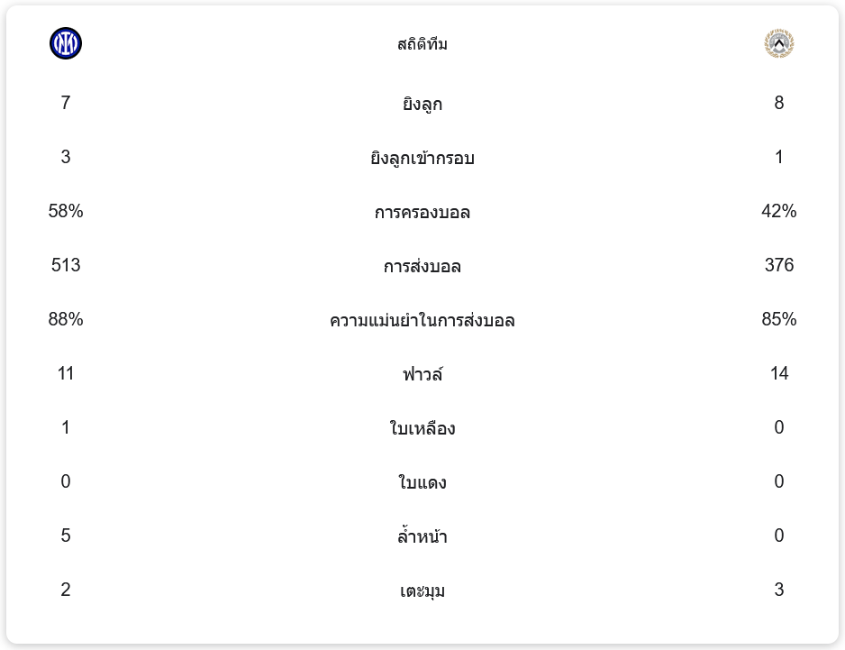 อินเตอร์ครองบอล 58% และจ่ายบอลสำเร็จ 513 ครั้ง ความแม่นยำสูงถึง 88% ยิงทั้งหมด 7 ครั้ง เข้ากรอบ 3 ขณะที่อูดิเนเซ่ครองบอล 42% จ่ายบอลสำเร็จ 376 ครั้ง ยิงทั้งหมด 8 ครั้ง แต่เข้ากรอบเพียง 1 ครั้ง ซึ่งแสดงให้เห็นถึงประสิทธิภาพในการเล่นของอินเตอร์ที่เหนือกว่าอย่างชัดเจน