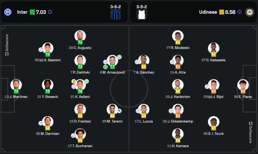 แผนการเล่น 3-5-2 ของอินเตอร์ มิลาน เน้นครองบอลในแดนกลาง และเปิดเกมรุกจากปีกสองข้างโดย ดุมฟรีส์ และ ออกุสโต้ ขณะที่กองหน้าสองคนมีบทบาทสำคัญในการสร้างพื้นที่และจบสกอร์ ส่วนอูดิเนเซ่ที่ใช้แผนเดียวกันกลับเจาะเกมรับของอินเตอร์ไม่เข้าเนื่องจากความแข็งแกร่งในแดนหลังของทีมเจ้าบ้าน